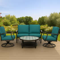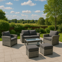Важно е и комплектът, който изберете, да си отива с околността на вашата градина, като е желателно да има някакви естетични препратки към неща, които са вече налични във вашата градина. Това може да се орнаменти от оградата, фасадата на къщата или дори други мебели, които вече притежавате.