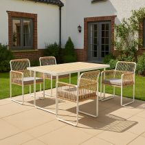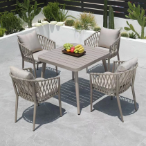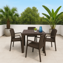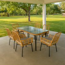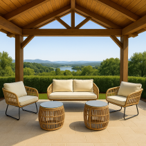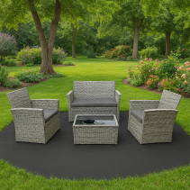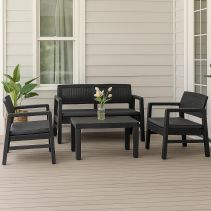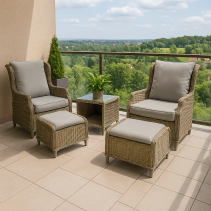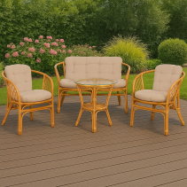 Друг популярен материал за градински комплекти е изкуствения ратан. Той е изработен от здрава пластмаса, която е устойчива на механични повреди и влиянието на климата. Дизайна на мебелите от ратан е много интересен и подходящ за добавяне в екстериора на вашия двор или веранда.