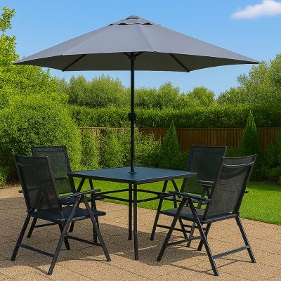 Комплектът градинска маса + 4стола и чадър е стилно и удобно решение за вашата градина, тераса или вътрешен двор. Той включва: