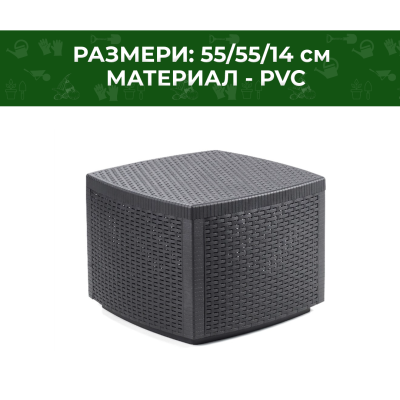 С размери 55 x 55 x 14 см масата е компактна и удобна за малки пространства. Модерният дизайн с ратанова текстура внася стил и се съчетава лесно с различни видове градински мебели.