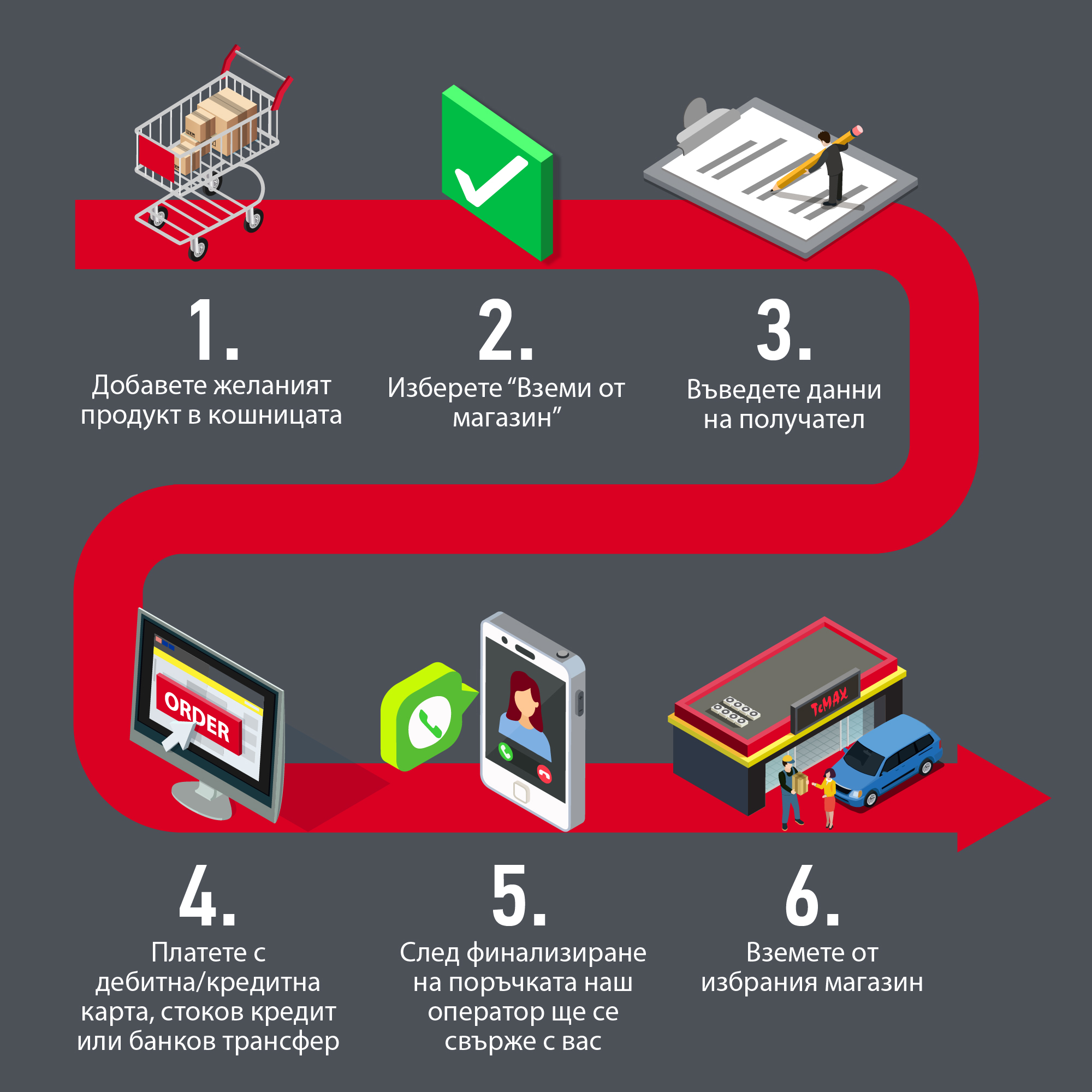 За всички, които не обичат да чакат по опашки предлагаме ви да заплатите продуктите, които сте си избрали онлайн и само да ги вземете от обслужващият ви магазин от сектора за получаване на онлайн пратки.